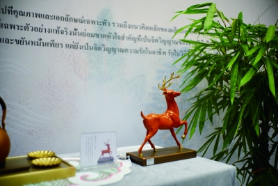 “這只鹿的形象是依照中國(guó)故宮博物院館藏珍品、清代宮廷畫家郎世寧所繪《秋林群鹿圖》設(shè)計(jì)的,現(xiàn)在經(jīng)過國(guó)家級(jí)非遺熔銅傳承人朱炳仁大師之手,把它從畫中‘請(qǐng)出來’變成立體的銅塑,采用百年傳統(tǒng)工藝及熱著色專利技術(shù)精制而成。”不久前在泰國(guó)曼谷中國(guó)文化中心開幕的“造物記——來自中國(guó)的創(chuàng)意禮物”展覽現(xiàn)場(chǎng),泰國(guó)志愿者們?yōu)楝F(xiàn)場(chǎng)觀眾講述文創(chuàng)產(chǎn)品《綻鹿頭角》背后的故事。