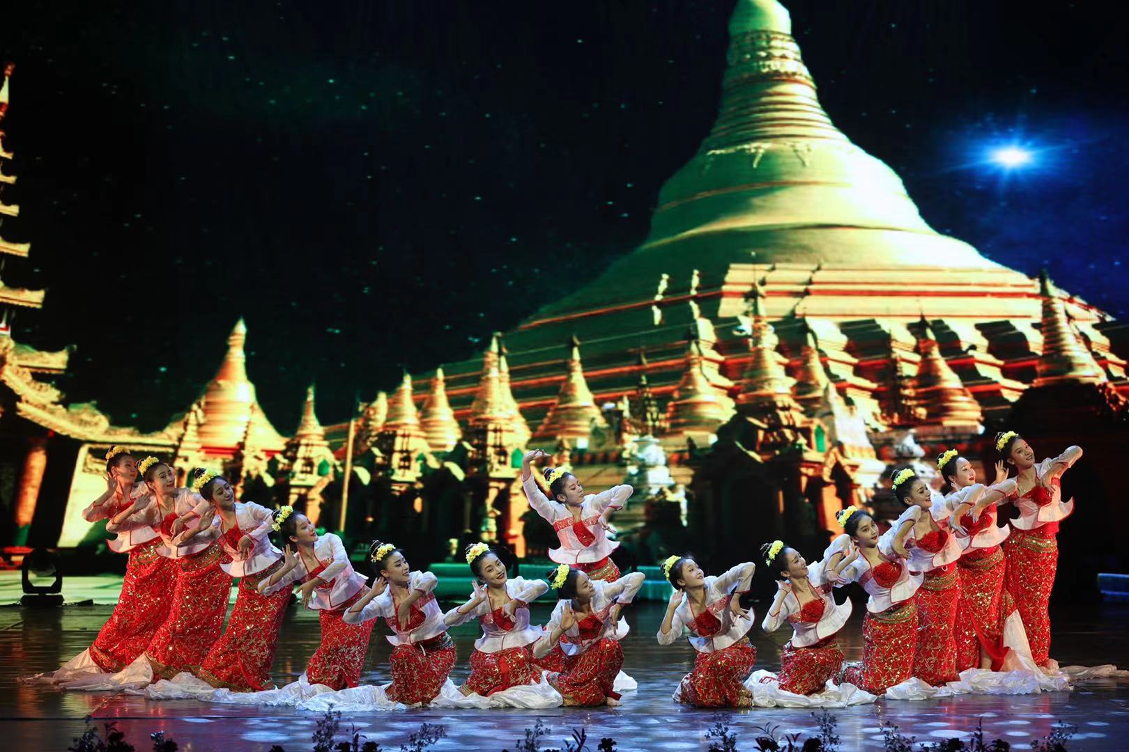 馬來西亞流行的民間舞蹈《扎賓》是當(dāng)?shù)鼐用竦墓?jié)日舞蹈。廣西藝術(shù)學(xué)院的演員們身著馬來西亞民族服裝,在舞臺(tái)上跳起“扎賓”舞,向到場(chǎng)的來賓傳遞出歡樂祥和的氣氛。緬甸舞蹈《木偶舞》是緬甸歷史悠久的傳統(tǒng)舞蹈,深受當(dāng)?shù)厝嗣竦南矏邸D九嘉柰ㄟ^人的肢體來模仿大自然中的動(dòng)物等形態(tài),詼諧可愛,云南演藝股份有限公司的演員們演繹了這部緬甸經(jīng)典藝術(shù)作品,展現(xiàn)中緬兩國(guó)藝術(shù)交流融合、互相借鑒的和諧之美。