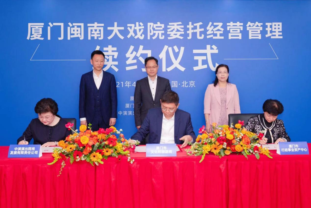 2021年4月17日上午,中國對外文化集團(tuán)總部舉行廈門閩南大戲院委托經(jīng)營管理續(xù)約儀式。根據(jù)協(xié)議,集團(tuán)旗下中演院線對廈門閩南大戲院的受托運(yùn)營管理期將延長至2025年。本次合作續(xù)簽代表了廈門市政府對中國對外文化集團(tuán)旗下中演院線過去八年來經(jīng)營管理工作的高度認(rèn)可,標(biāo)志著雙方的“央地合作”更加穩(wěn)固、更加緊密。