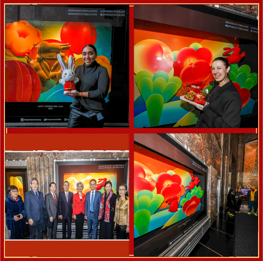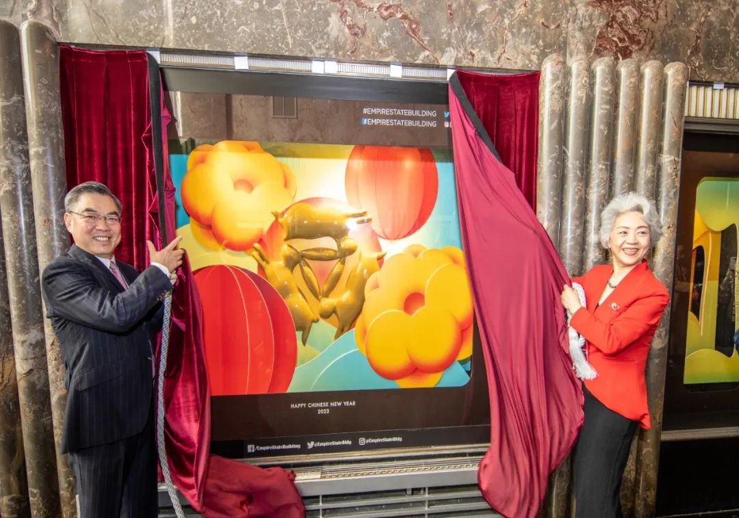 活動于美國東部時間1月20日上午在紐約帝國大廈一層正式亮相。黃屏總領事與夫人張愛萍為紐約帝國大廈2023年“歡樂春節生肖櫥窗展”揭幕,與中外嘉賓共同欣賞生動精美的櫥窗展覽。
