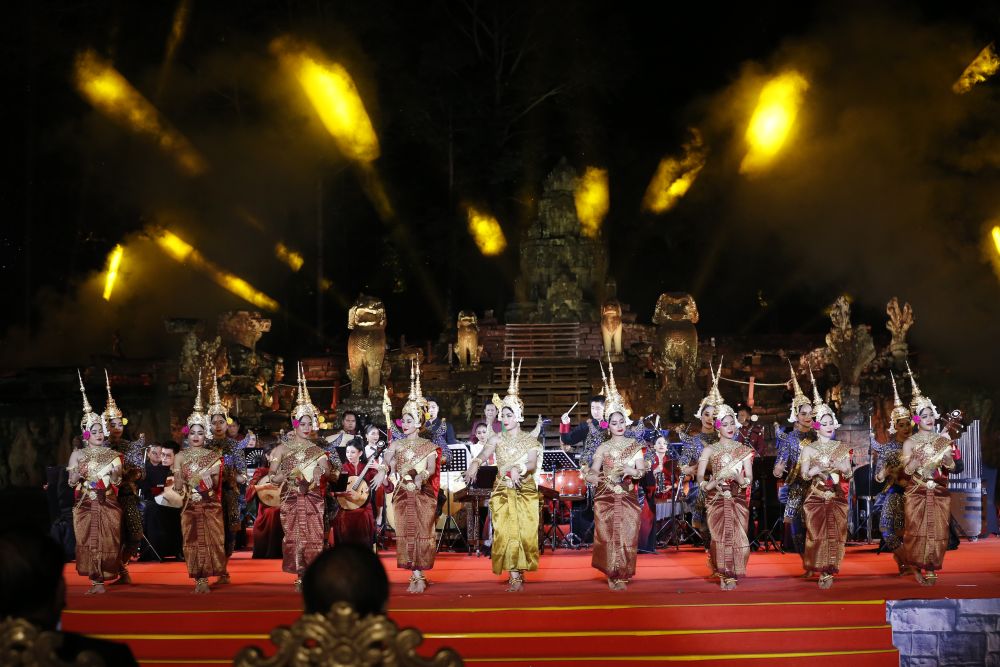 來自中央民族樂團、中國歌劇舞劇院、中國國家話劇院的藝術家與柬埔寨文化藝術部舞蹈團、樂團的藝術家,以及柬埔寨兒童合唱團聯袂帶來了精彩的演出。柬埔寨諾羅敦·珍娜小公主深情演唱象征中柬友誼的歌曲《懷念中國》;中柬樂團合奏民樂節目《祝賀》,用音樂獻上對彼此最真摯的祝福;中國“樂器之王”琵琶與柬埔寨古老樂器長臂琴共同演奏《玫瑰印象》,兩國最具代表的音色在共鳴中奏出和美之音;最后,中柬兩國藝術家合作兩國代表性歌曲《茉莉花》《高棉的靈魂》,將演出推向高潮。